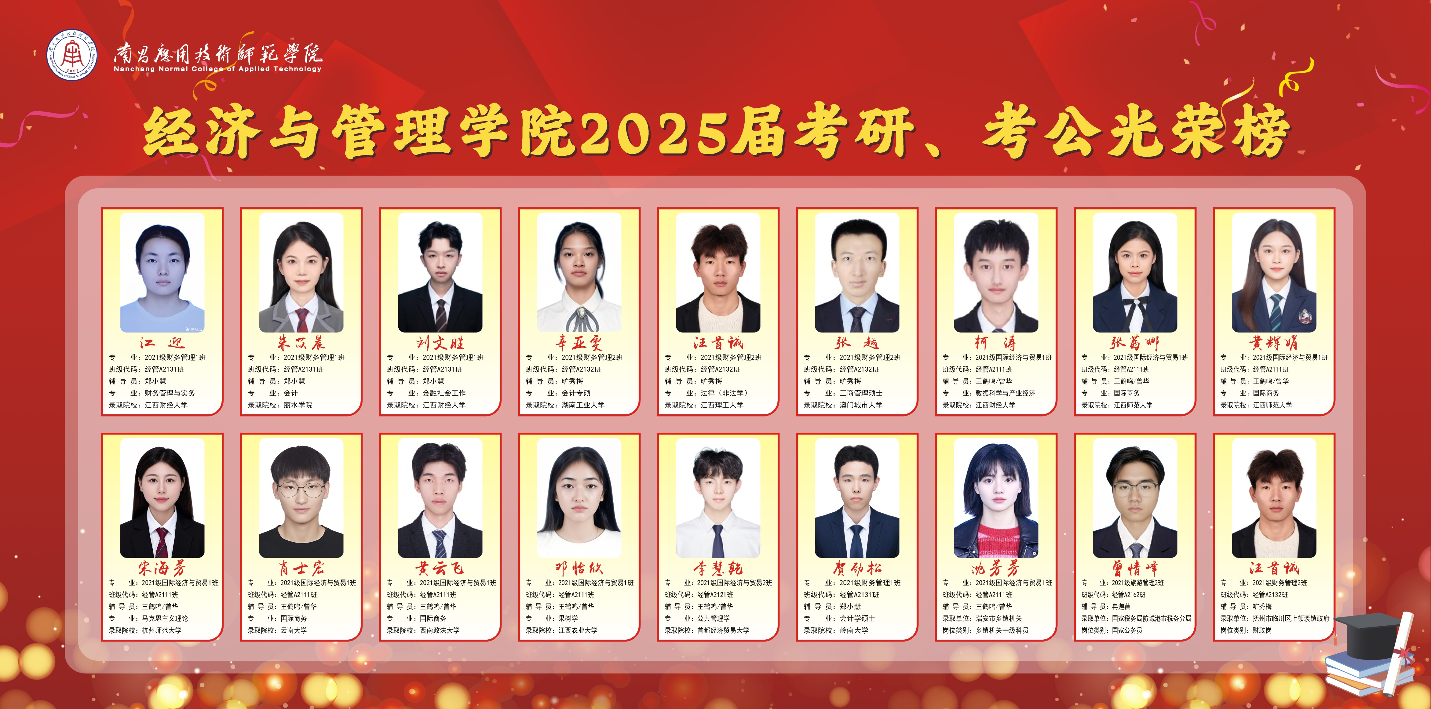 YABO鸭脖2025届考研、考公学生名单汇总表序号学生姓名专业/班级辅导员录取院校/单位专业/岗位类别1江迎2021级财务管理1班郑小慧江西财经大学财务管理与实务2朱苡晨2021级财务管理1班郑小慧丽水学院会计3刘文胜2021级财务管理1班郑小慧江西财经大学金融社会工作4幸亚雯2021级财务管理2班旷秀梅湖南工业大学会计专硕5汪首诚2021级财务管理2班旷秀梅江西理工大学法律(非法学)6张越2021级财务管理2班旷秀梅澳门城市大学工商管理硕士7柯涛2021级国际经济与贸易1班王鹤鸣/曾华江西财经大学数据科学与产业经济8张茜娜2021级国际经济与贸易1班王鹤鸣/曾华江西师范大学国际商务9黄辉娟2021级国际经济与贸易1班王鹤鸣/曾华江西师范大学国际商务10宋海芳2021级国际经济与贸易1班王鹤鸣/曾华杭州师范大学马克思主义理论11肖士宏2021级国际经济与贸易1班王鹤鸣/曾华云南大学国际商务12黄云飞2021级国际经济与贸易1班王鹤鸣/曾华西南政法大学国际商务13邓怡欣2021级国际经济与贸易1班王鹤鸣/曾华江西农业大学果树学14李慧乾2021级国际经济与贸易2班王鹤鸣/曾华首都经济贸易大学公共管理学15贺劲松2021级财务管理1班郑小慧岭南大学会计学硕士16沈芳芳2021级国际经济与贸易1班王鹤鸣/曾华浙江省公务员乡镇机关一级科员17曾情峰2021级旅游管理2班冉迦葆国家税务局分局国家公务员18汪首诚2021级财务管理2班旷秀梅江西省公务员财政岗