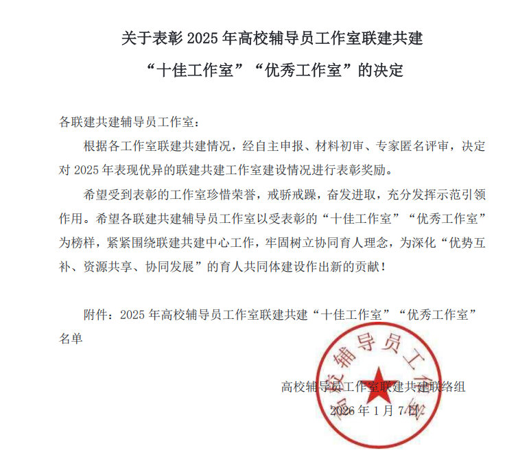 近日,高校辅导员工作室公布2025年联建共建表彰名单,鸭脖“匠心领航辅导员工作室”凭借突出成效,获评“优秀案例”与“优秀工作室”双项荣誉,主持人兰金辉老师的工作得到专家充分认可。该工作室秉持“协同育人、思政赋能”理念,深耕联建共建工作,凝练形成《关于“匠心领航”辅导员工作室联建共建实践成果的思政与学术融合提炼策略》,入选“协同研究学术成果”类优秀案例。同时,工作室积极联动省内外高校,在资源共享、思政创新等方面成效显著,成功获评“优秀工作室”。此次双项获奖,是对工作室建设的肯定,更是鞭策。兰金辉老师表示,将带领团队珍惜荣誉,深化协同合作,发挥示范作用。鸭脖将持续支持辅导员工作室建设,以高质量协同育人助力思政教育提质增效。文/兰金辉 一审/兰金辉 二审/朱红梅 三审/龙犇
