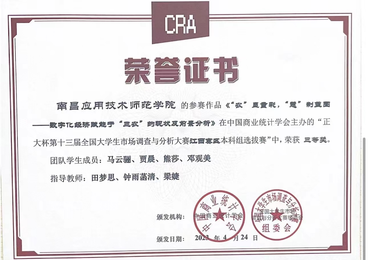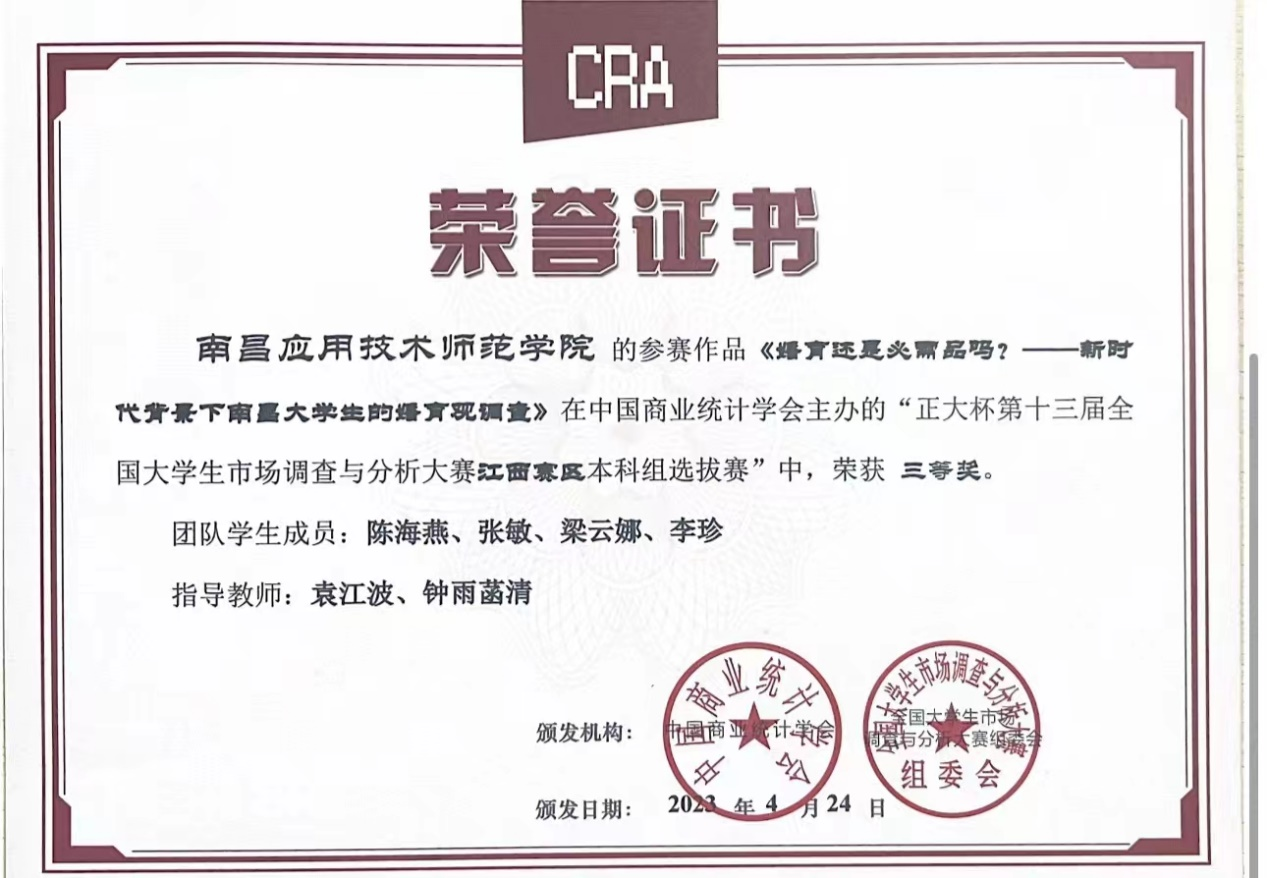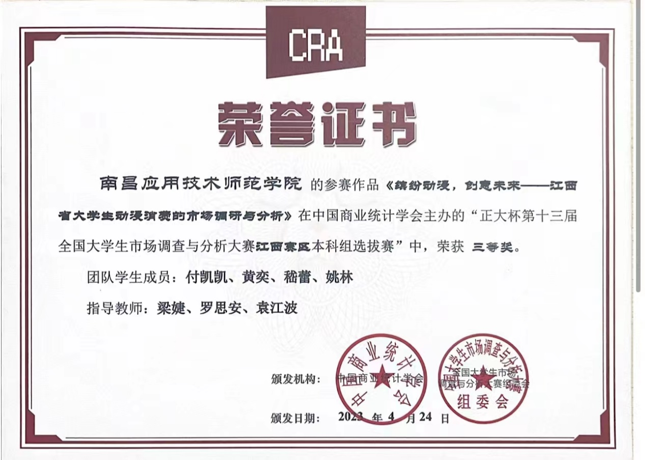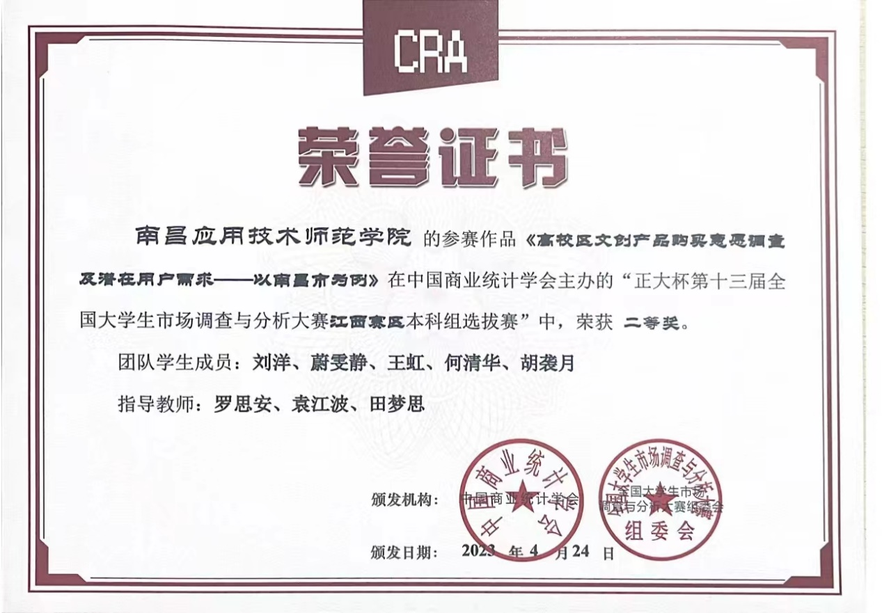 近日,由中国商业统计学会主办的“正大杯第十三届全国大学生市场调查与分析大赛”,江西赛区本科组已公布比赛结果,鸭脖YABO鸭脖罗思安、袁江波、田梦思、梁婕和钟雨菡清老师指导的学生参赛作品获得比赛二等奖1项,三等奖3项。