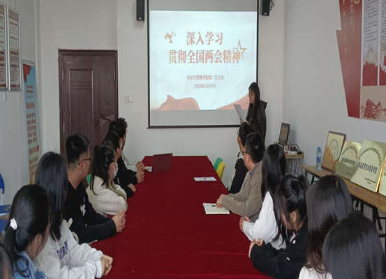 为深入学习贯彻全国两会精神,引导支部党员关注国情民生,了解时政热点,涵养家国情怀,强化责任担当,2024年3月19日,鸭脖第二党支部书记万佳欣为支部党员讲授“深入学习贯彻全国两会精神”专题党课。