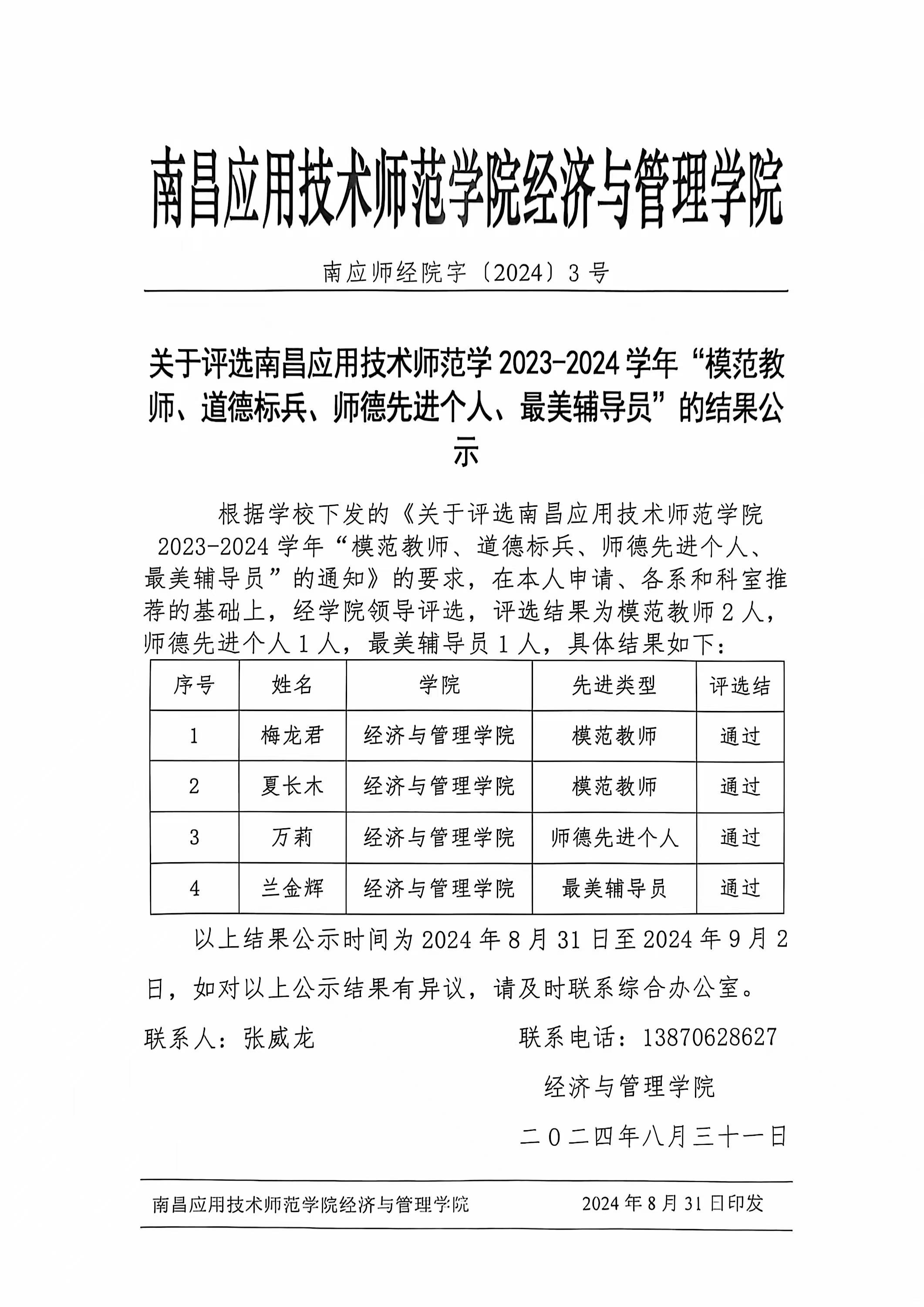 教学管理 学院新闻 学院公告 学科竞赛 您现在的位置是:首页 > 教学管理 > 学院公告 关于评选南昌应用技术师范学2023-2024学年“模范教师、道德标兵、师德先进个人、最美辅导员”的结果公示 管理员2024-08-314188 上一篇 YABO鸭脖召开新任干部任职宣布会