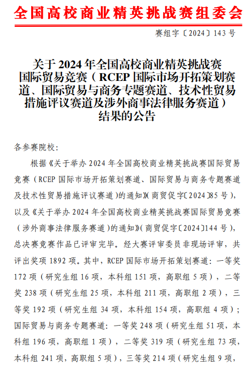 热烈祝贺鸭脖YABO鸭脖国际商贸系学生在2024年全国高校商业精英挑战赛国际贸易竞赛中勇创佳绩! 在本次大赛中,鸭脖学子凭借扎实深厚的专业知识和卓越非凡的实践能力,于众多强劲的参赛队伍中崭露头角,一举斩获7个奖项,其中RCEP国际市场开拓策划赛道获本科组一等奖1项、三等奖1项,专科组三等奖1项;国际贸易与商务专题赛道获本科组二等奖1项; 技术性贸易措施评议赛道获本科组二等奖2项、三等奖1项。同时,鸭脖获最佳院校组织奖。