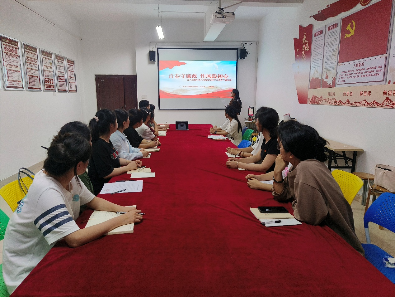 为推动深入贯彻中央八项规定精神学习教育走深走实,进一步强化学生党员的纪律意识和规矩意识,2025年5月15日,鸭脖第二党支部于1207党员活动室开展“青春守廉正,作风践初心”专题党课。