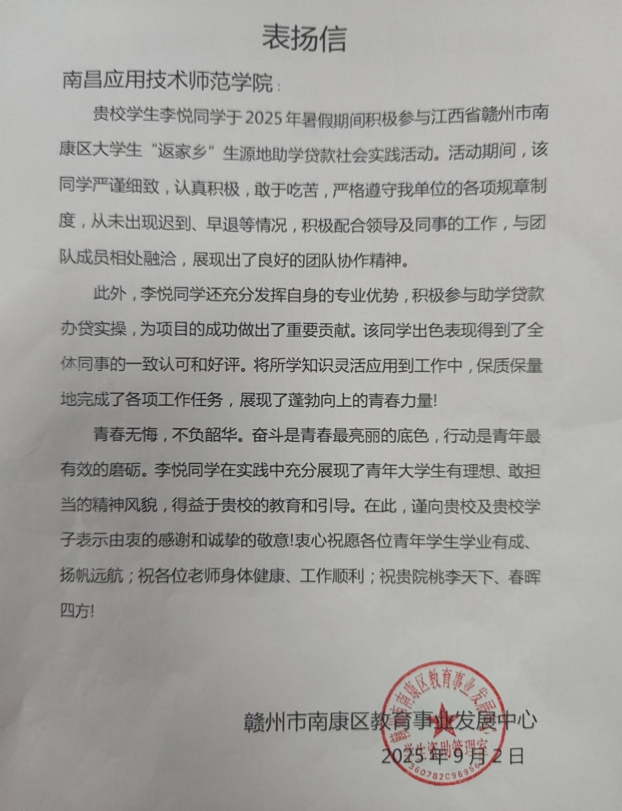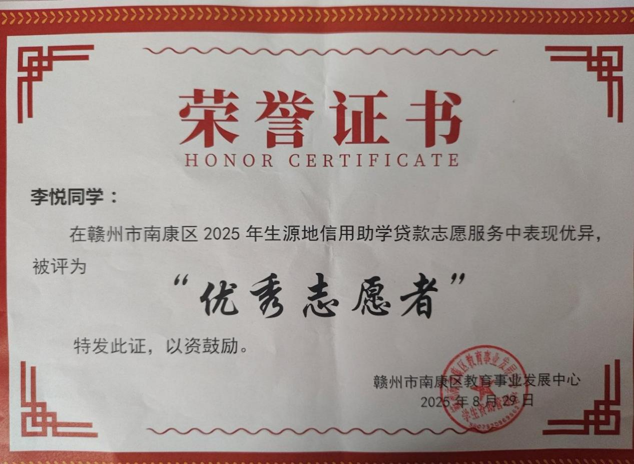 脚踏实地的付出,终获官方高度认可。赣州市南康区教育事业发展中心为她颁发“优秀志愿者”荣誉证书,南康中学、南康区教育事业发展中心也先后发来表扬信,称赞她工作认真负责、协作能力突出、专业素养过硬,生动展现了当代大学生的良好风貌。