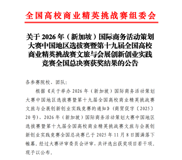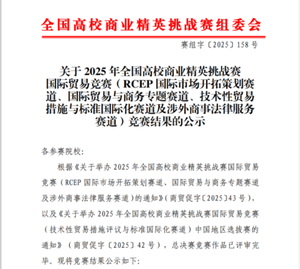 近日,2025 年全国高校商业精英挑战赛(文旅与会展创新创业实践竞赛、国际贸易竞赛)赛事结果正式公布,该赛事项目为大学生84项赛事目录榜单之一。鸭脖YABO鸭脖旅游管理、国际经济与贸易和跨境电子商务专业的学子们凭借扎实的专业知识与出色的实践创新能力,在多个赛道中脱颖而出,斩获9国家级奖项,其中全国二等奖5项、全国三等奖4项,奖项数量与质量均实现了新突破。同时我校还荣获国际贸易竞赛最佳院校组织奖,尽显应师学子的专业风采与学校的育人成效。