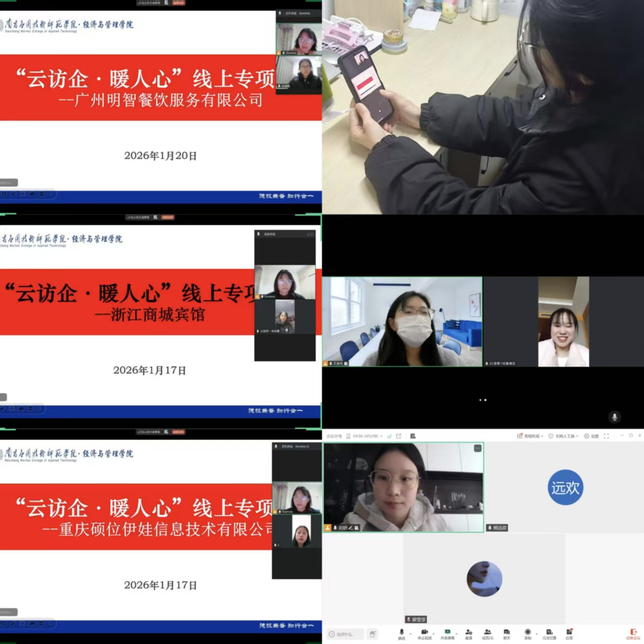 为深入贯彻校企合作育人理念、推进产教融合发展,精准对接行业发展需求,拓宽学生实习就业渠道,近期,鸭脖智慧文旅系组织教师通过线上线下形式向义乌幸福湖国际会议中心、江西越兴工程检测有限公司、重庆硕位伊娃信息技术有限公司、上海源谱诺文化科技有限公司、嘉兴南湖宾馆有限公司等十余家企业开展 “访企拓岗”专项行动。各企业人力部门负责人或业务骨干代表参加座谈。