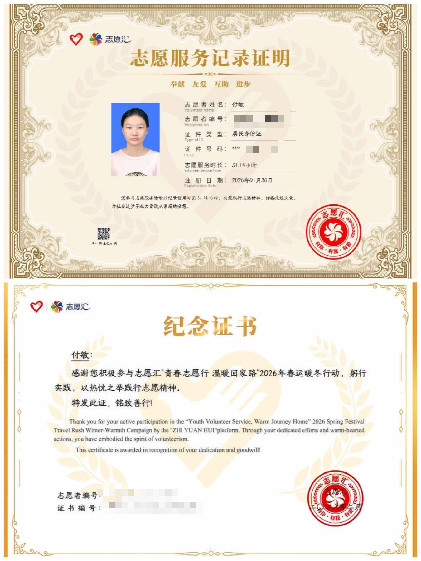 这个寒假,我在图书馆守护书香,在春运一线温暖归途,在两项志愿服务中锤炼品格、增长才干。从图书整理到旅客引导,从文明劝导到应急帮扶,每一项工作都让我更加懂得责任与奉献的意义。