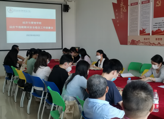 对国庆假期期间的安全工作,王颖书记首先传达省教育厅和学校安全稳定工作会议精神;并对学院安全稳定工作进行部署,提出几点要求:一是加强学院教学场所、实验实训室的安全隐患大排查;二是加强校外毕业生的安全教育和实习管理;三是加强持续跟进关心关注学生心理健康,促进学生健康成长才;四是加强校内学生思想引导和安全教育,及时掌握学生假期去向,做好各类信息数据收集;五是积极组织在校学生参加假期各类校园活动,提升大学生文化素养。